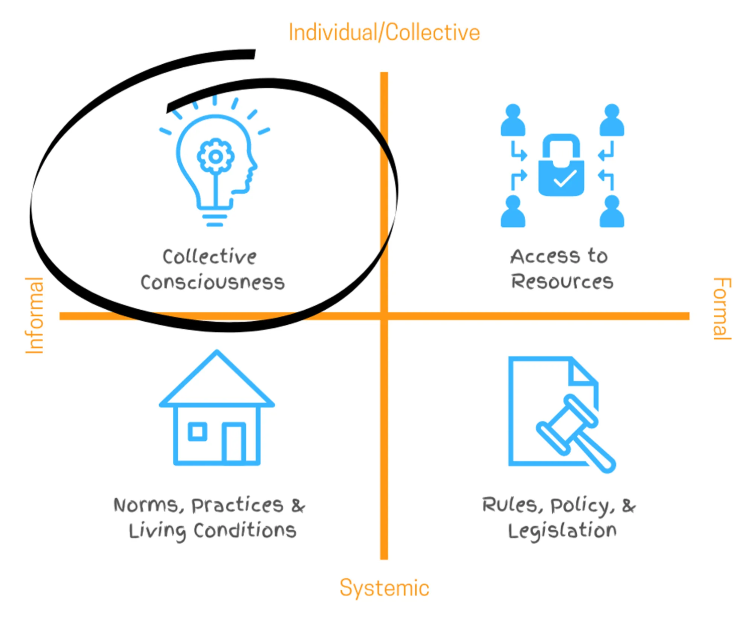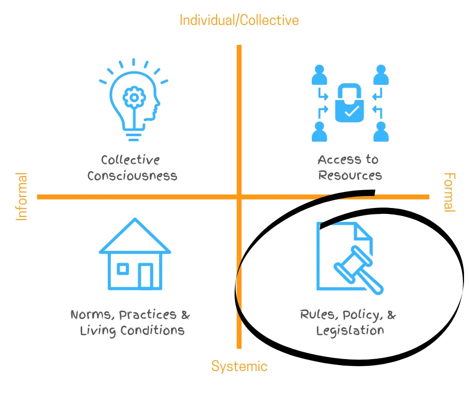 Now, examine changes related to legislation, policy, and the formal structures that shape 'business as usual'. Consider the systemic shifts necessary to address root causes of issues: